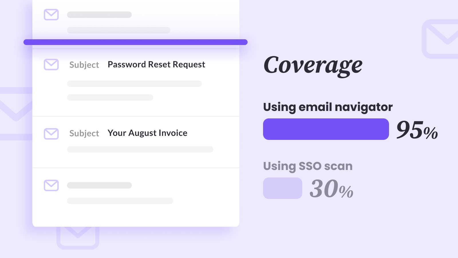 While we offer the industry standard methods of SSO and cloud and website scans, those methods often combine for less than 50% coverage of data systems (average coverage comes in between 30-40% using these methods). Our Email Navigator’s capabilities are simply on another level, as it can discover much closer to 100% of data systems by itself, dwarfing the reach of the other options.