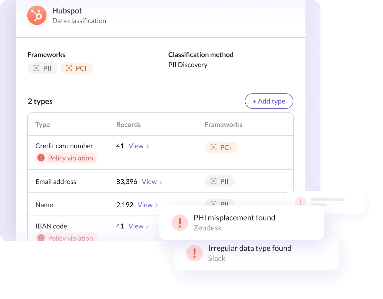 If and when data is misplaced, such as PHI within Hubspot for example, Admins can receive an alert via the Data Types page and also on their MineOS dashboard, leading them right to the culprit for instant targeted remediation.