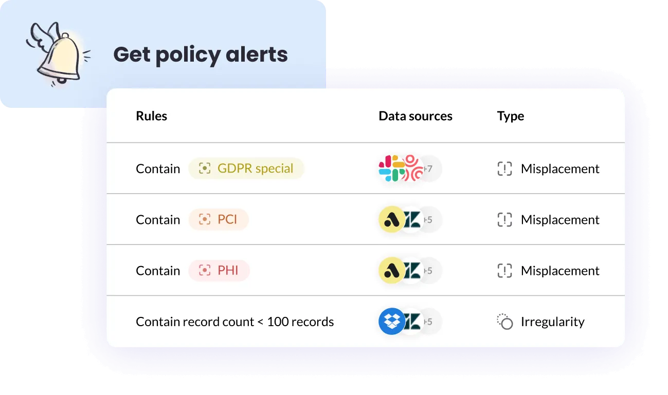 Create policies based on frameworks, such as misplacement of data related to PHI, GDPR and PII, or policies based on number of records, and then assign any number of data sources you like to the policy.