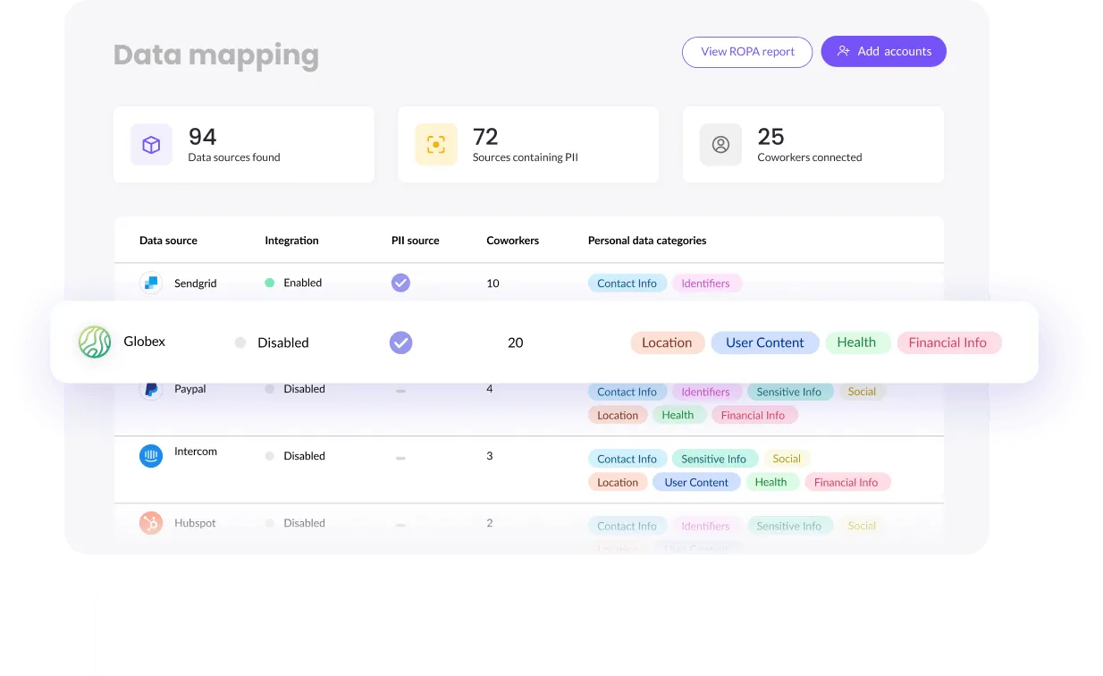 Skip the manual work. Easily export compliance reports to .csv for a live blueprint of all data sources and processing, thanks to our thorough and continuous data mapping technology.
